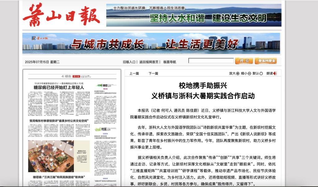 去年,浙科大人文与外国语学院团队以“诗韵新坝共富华章”为主题,在新坝村挖掘文化、传承非遗,探索农文旅融合,荣获“全国十佳实践团队”,产出《新坝人说新坝》等成果,彰显了青年在乡村振兴中的生力军作用。今年,团队再度聚焦新坝村,助力义桥乡村振兴事业更上层楼。