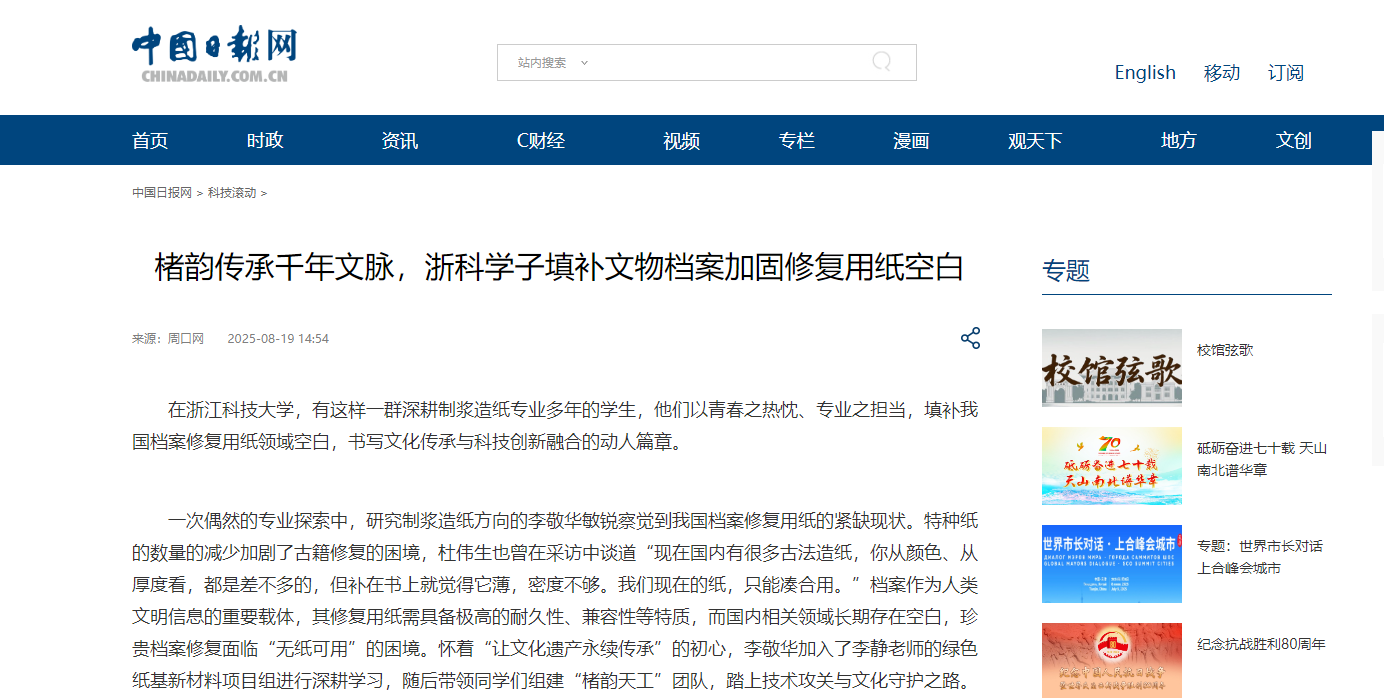 如今,楮韵天工团队仍在探索前行,他们期待让楮韵纸走进更多档案修复现场,为更多珍贵档案续命,让历史文化在科技赋能下熠熠生辉。这群浙科学子用专业深耕与文化热忱证明:青春力量可以成为文化传承创新的先锋,在科技与人文交织的赛道上,跑出属于新时代的文化守护加速度。未来,相信他们会继续以纸为媒、以技为刃,在文化传承与科技创新融合之路上,书写更多青春担当的精彩故事,让档案修复用纸成为连接历史与未来的坚固桥梁,让千年文脉在青春守护中永续传承。