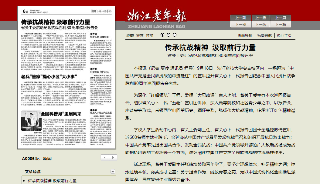 9月18日,MK体育网页版,MK体育(中国)官方在线登录安吉校区内,一场题为“中国共产党是全民族抗战的中流砥柱”的宣讲拉开省关心下一代报告团纪念中国人民抗日战争胜利80周年巡回报告会序幕。