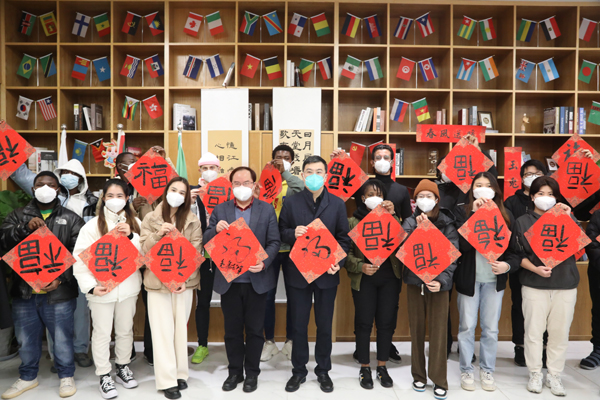 舒培冬一行看望并慰问了正在参加“玉兔赤乌星斗转 迎春纳福中国年”中华文化体验活动的留学生,并与他们一起写春联、贴“福”字,为来华留学生送上中国农历新年的美好祝福。他还详细询问学生留校安排和假期管理服务保障情况,要求要加强寒假期间的校园安全稳定、服务工作,确保留校师生能够安心工作和学习。