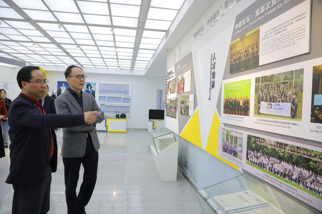 赵东福、单胜道陪同方军一行参观中德合作馆,介绍了我校中德合作办学有关情况和取得的合作成果。
