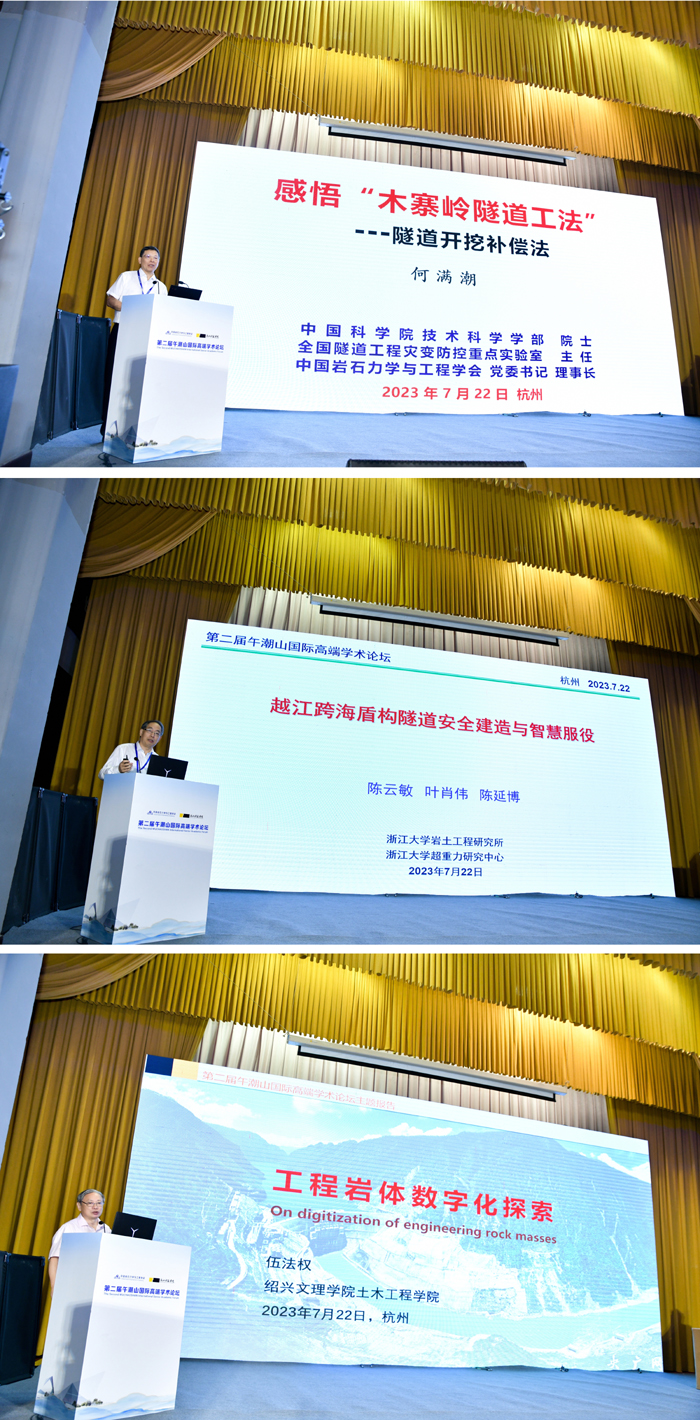 在学术报告环节,何满潮院士、陈云敏院士、伍法权院士、蒋宇静院士分别以《感悟木寨岭隧道工法—隧道开挖补偿法》《越江跨海盾构隧道安全建造与智慧服役》《工程岩体数字化探索》《非完整岩体剪切与剪切-渗流耦合特性研究》为题展开主旨报告,浙江科技学院未来城市研究院院长唐春安教授,南京大学特聘教授、国际环境岩土工程学会(ISEG)主席、国家杰青施斌教授,华东交通大学校长、国家杰青徐长节教授也分别以《强震区地震波的自由面动力学效应》《光纤DAS与振动仿真双驱动的岩土工程灾变事件智能识别》《深基坑设计理论与安全控制研究进展》为题作主旨报告。主旨报告围绕“岩石动力学与新材料应用开发”领域最新的研究成果进行深度分享,让线下线上聆听报告的人员对本行业本领域的发展有了更深的认识。