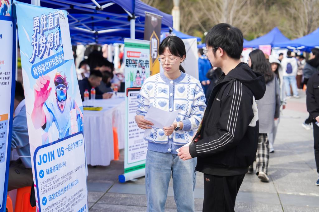招聘会现场毕业生不时驻足感兴趣的企业展位,积极与招聘人员交流,了解岗位招聘要求、企业培养规划和福利待遇等内容。此外现场还设置了招聘服务、就业指导等专区,提供“定制化”的规划指导、“精准化”的政策咨询、“智能化”的简历问诊等服务。