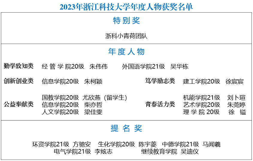 据悉,本次年度人物评选以“激扬青春绘华章 奋楫笃行启新程”为主题,经过多轮评审,除特别奖外,还有10位同学获得年度人物的荣誉。他们有的以优异的成绩和扎实的专业知识诠释了“勤学致知”的真谛;有的积极投身社会实践,用青春和热血书写了“青春奉献”的华章;有的凭借坚韧不拔的意志和励志精神,成为了“笃实励志”的楷模……他们用自己的成长故事,阐释了浙科青年的闪光形象。