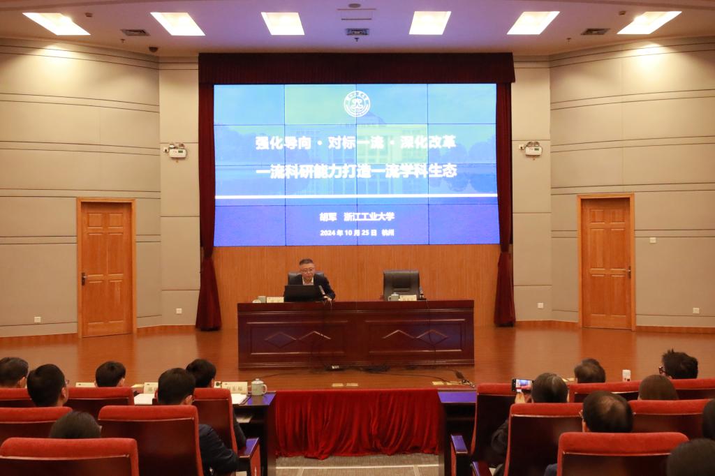 大会邀请浙江工业大学副校长胡军以《强化导向·对标一流·深化改革——一流科研能力打造一流学科生态》为题作学科建设专题报告。在简要介绍了浙江工业大学学科建设基本情况和近年来取得的成绩后,他重点介绍工大近年来推动学科建设快速发展的举措。