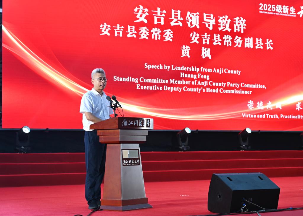 黄枫代表安吉县委、县政府和全县人民向新同学表示最热烈的欢迎。他表示,安吉县正在奋力打造“青年入乡首选地”这张金名片,真诚希望同学们在安吉这片热土上潜心求学、茁壮成长!更期待大家学成之后,能选择安吉、扎根安吉、共建安吉,在这里尽情书写属于你们的青春华章!