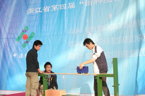 每年一届的全省大学生结构设计竞赛,是由浙江省大学生科技竞赛委员会主办的面向我省大学生的主要学科竞赛之一,旨在开拓大学生的创新思维和提高实际动手能力,培养团队精神,增强大学生的工程结构设计和实践能力,浓郁校园学术氛围,促进各高校间的相互交流和学习。自2002年起至今已经成功举办了三届,本届比赛的题目是“桥梁模型的制作”,分为“单跨”或“双跨”两种形式,由参赛选手自由选择,制作材料为2毫米厚的有机玻璃、氯仿黏合剂。竞赛的考核指标分为“单位质量的承载力”和“最大挠度”两项。浙江中浩检测工程有限公司赞助了本届比赛。