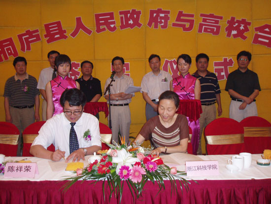 在本次签字协议仪式上,鲁凤书记代表学校与桐庐县人民政府签订了建立就业实习培训基地合作协议书,并做大会发言。在本次签字仪式上签字的在杭高校还有浙江大学、浙江工业大学、浙江理工大学、中国计量学院、浙江大学城市学院等。                                          (学生处)