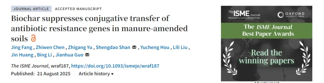题为“Biochar suppresses conjugative transfer of antibiotic resistance genes in manure-amended soils”的论文在The ISME Journal上发表,方婧教授为第一作者,单胜道教授和澳大利亚昆士兰大学郭建华教授为共同通讯作者,MK体育网页版,MK体育(中国)官方在线登录为第一单位。本论文通过宏基因组测序分析和土壤微宇宙实验,结合流式细胞术和16S rRNA基因扩增子测序等技术,探究生物炭对粪肥改良土壤中抗生素抗性基因(ARGs)接合转移的影响。该研究为理解粪肥施用导致的ARGs传播风险提供了直接证据,证实了生物炭在控制环境中ARGs传播方面的潜力,为农业生产中粪肥土地利用的风险管控和ARGs污染治理提供了科学依据和有效策略。