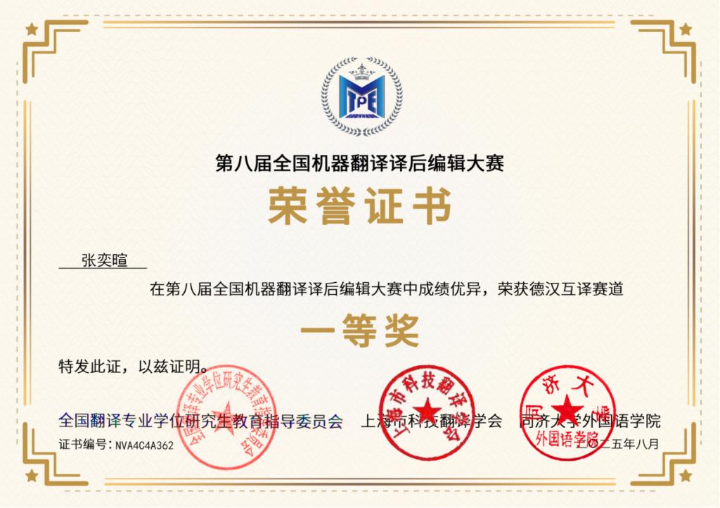 近日,2025年第八届全国机器翻译译后编辑大赛决赛圆满落幕。我校中德学院2024级张奕暄同学凭借扎实的德语功底与出色的译后编辑能力,获德语赛道一等奖,指导老师胡一帆获优秀指导教师奖。